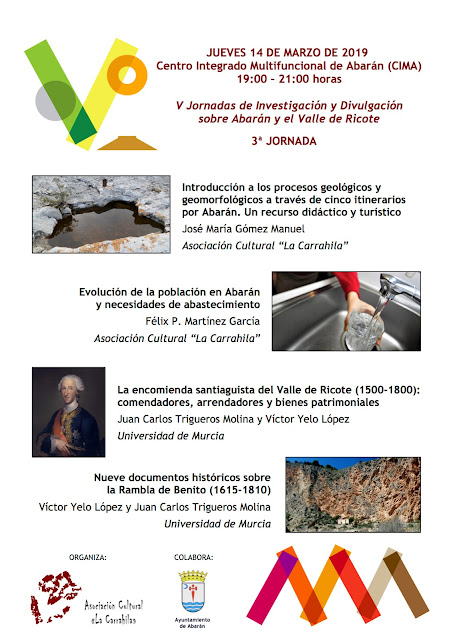 El próximo jueves 14 de marzo, entre las 19:00 y 21:00 horas y en la Sala Adolfo Suárez del CIMA (C/ David Templado, 54), tendrá lugar la tercera sesión de las V Jornadas de Investigación y Divulgación sobre Abarán y el Valle de Ricote.