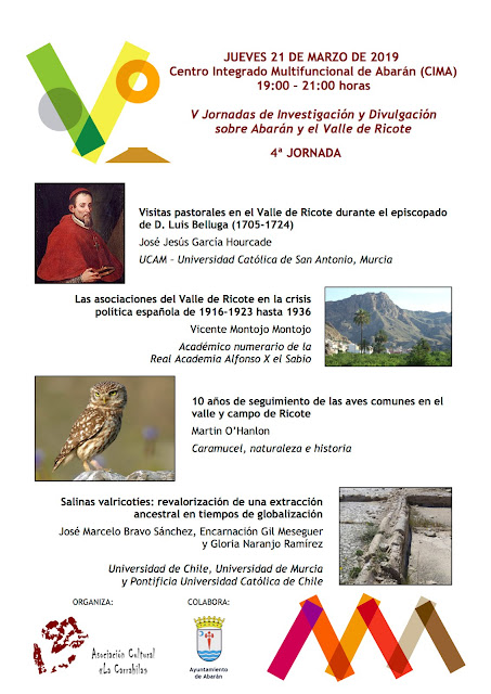 El próximo jueves 21 de marzo, entre las 19:00 y 21:00 horas y en la Sala Adolfo Suárez del CIMA (C/ David Templado, 54), tendrá lugar la cuarta sesión de las V Jornadas de Investigación y Divulgación sobre Abarán y el Valle de Ricote.