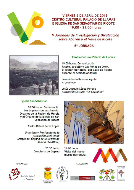 Como en la edición de 2015 (III JIDAV), en esta ocasión (V JIDAV), volvimos a ofrecer al pueblo de Ricote nuestros conocimientos. Le tocó el turno, una vez más, a Jesús Joaquín López Moreno, que, de la mano del arqueólogo Juan Antonio Ramírez Águila, realizaron una aproximación al origen del poblamiento y paisaje de Ricote, allá por los siglos centrales de la Edad Media (siglos XI y XII). El Centro Cultural Palacio de Llamas dio paso al templo parroquial de San Sebastián, para que el organista Carlos Rafael Pérez López hiciera un recorrido por los órganos históricos de nuestra región y nos deleitara tocando las teclas de ese instrumento majestuoso que tiene Ricote: su órgano histórico de mediados del siglo XVIII.