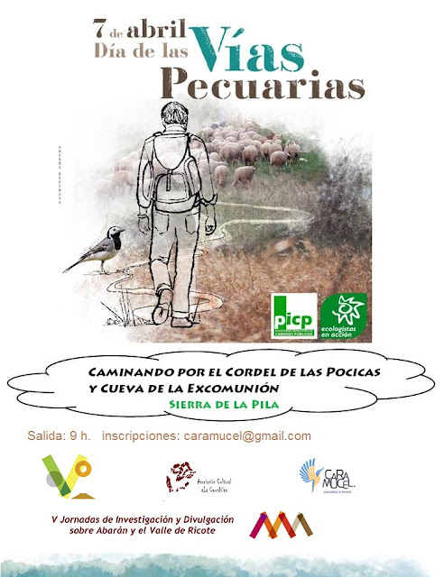 El domingo 7 de abril se clausuraron las V Jornadas de Investigación y Divulgación sobre Abarán y el Valle de Ricote a través de una ruta guiada por el Cordel de las Pocicas y Cueva de la Excomunión (Sierra de la Pila, Abarán), con la que las asociaciones «La Carrahila» y «Caramucel, naturaleza e historia» han querido sumarse a la celebración del Día de las Vías Pecuarias, jornada a nivel nacional promovida por la Plataforma Ibérica por los Caminos Públicos (PICP) y Ecologistas en Acción.
