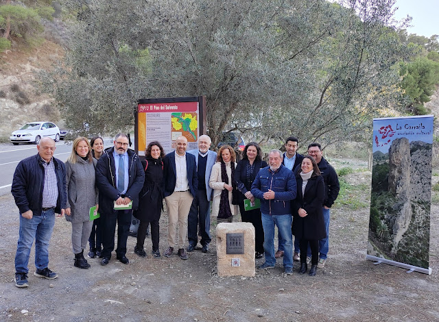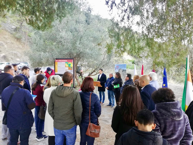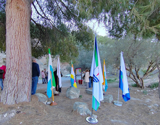 A las 15:00 horas tuvo lugar el acto de descubrimiento de una réplica de la placa del Premio Hispania Nostra 2023 en el Pino del Solvente (junto al km 3 de la carretera RM-520, Blanca), coincidiendo con el décimo aniversario de la señalización del árbol de junta bajomedieval o primer ayuntamiento comunal del Valle de Ricote, que supuso la primera actuación del proyecto cultural “Legado Vivo” desarrollado durante los últimos diez años en esta comarca murciana. Intervinieron, en este orden, Jesús Joaquín López Moreno (Asociación Cultural «La Carraila» y Caramucel, naturaleza e historia), Emilio del Carmelo Tomás Loba (etnógrafo, Doctor por la Universidad de Murcia), José Molina Ruiz (Director de la Sede Permanente de la Universidad de Murcia en Blanca), Bárbara Cordero Bellas (Directora General de Hispania Nostra) y Ángel Pablo Cano Gómez (Alcalde del Ayuntamiento de Blanca), contando con representantes administrativos de los ayuntamientos de Blanca, Ricote, Abarán y Villanueva del Río Segura y con Miguel Banegas García (Patronazgo Cultural «Yuse Banegas»), quien contribuyó a que el nuevo Pino del Solvente fuera señalizado en 2013. En esta ocasión, la placa del Premio Hispania Nostra 2023 fue descubierta por Caridad de Santiago Restoy, profesional jubilada de la Dirección General de Patrimonio Cultural de la CARM que trabajó en la creación de figuras de clasificación para proteger el paisaje cultural del Valle de Ricote y que es la autora del prólogo del libro editado desde la Asociación Cultural «La Carraila» con motivo de este histórico día para el Valle de Ricote.