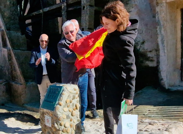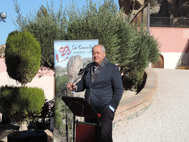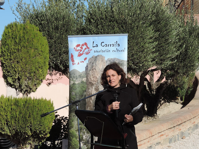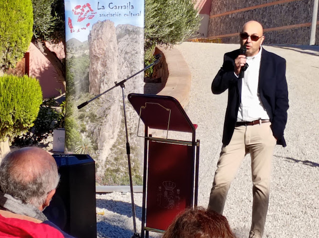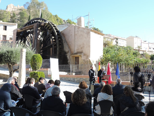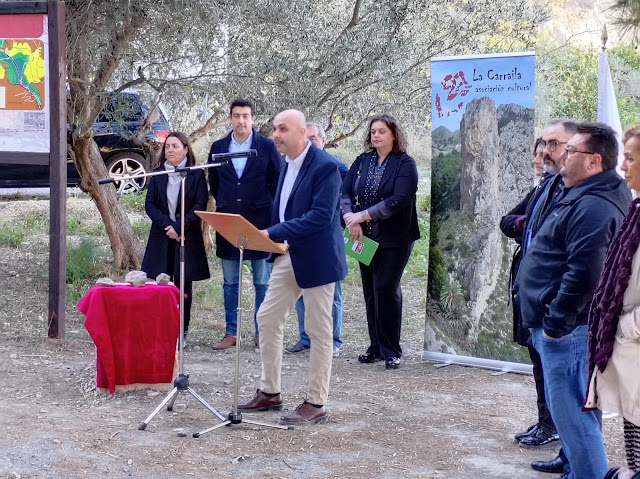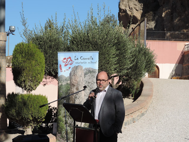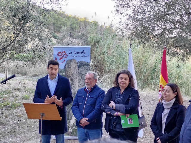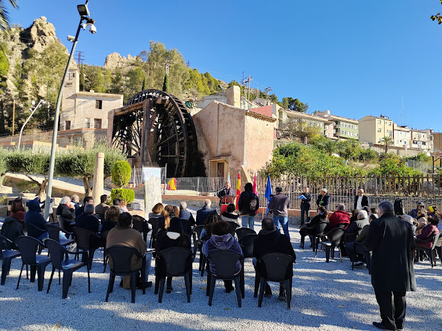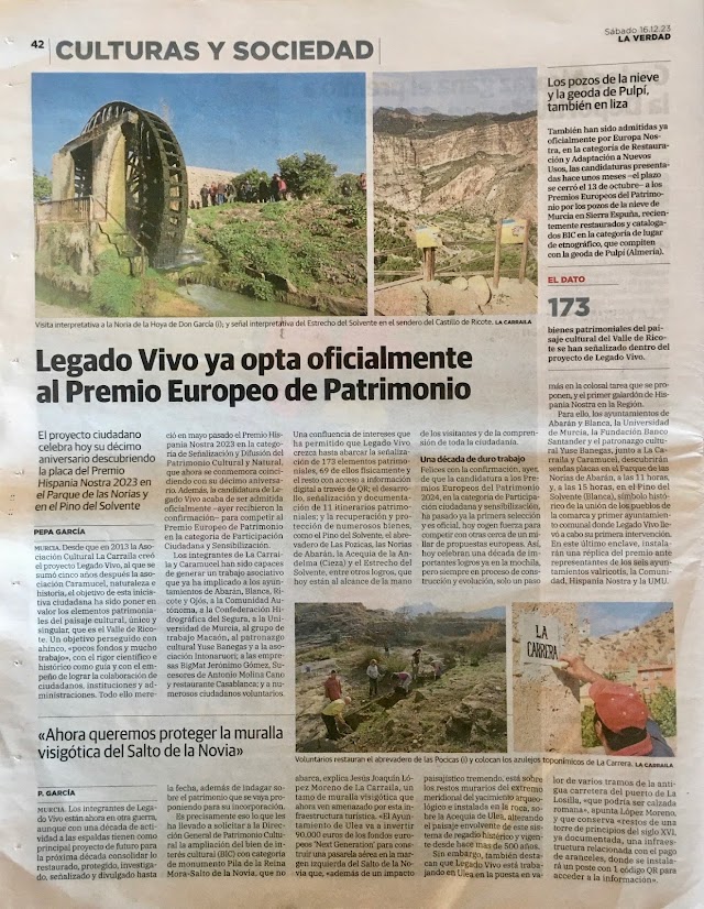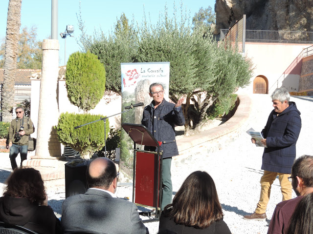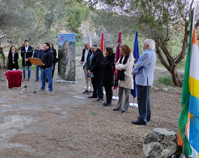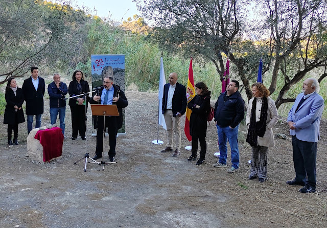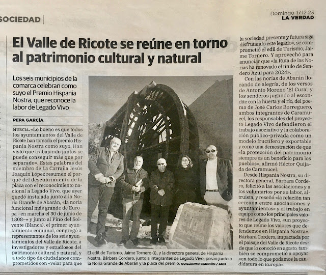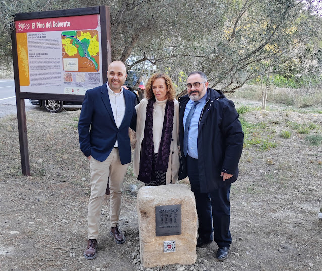 A las 15:00 horas tuvo lugar el acto de descubrimiento de una réplica de la placa del Premio Hispania Nostra 2023 en el Pino del Solvente (junto al km 3 de la carretera RM-520, Blanca), coincidiendo con el décimo aniversario de la señalización del árbol de junta bajomedieval o primer ayuntamiento comunal del Valle de Ricote, que supuso la primera actuación del proyecto cultural “Legado Vivo” desarrollado durante los últimos diez años en esta comarca murciana. Intervinieron, en este orden, Jesús Joaquín López Moreno (Asociación Cultural «La Carraila» y Caramucel, naturaleza e historia), Emilio del Carmelo Tomás Loba (etnógrafo, Doctor por la Universidad de Murcia), José Molina Ruiz (Director de la Sede Permanente de la Universidad de Murcia en Blanca), Bárbara Cordero Bellas (Directora General de Hispania Nostra) y Ángel Pablo Cano Gómez (Alcalde del Ayuntamiento de Blanca), contando con representantes administrativos de los ayuntamientos de Blanca, Ricote, Abarán y Villanueva del Río Segura y con Miguel Banegas García (Patronazgo Cultural «Yuse Banegas»), quien contribuyó a que el nuevo Pino del Solvente fuera señalizado en 2013. En esta ocasión, la placa del Premio Hispania Nostra 2023 fue descubierta por Caridad de Santiago Restoy, profesional jubilada de la Dirección General de Patrimonio Cultural de la CARM que trabajó en la creación de figuras de clasificación para proteger el paisaje cultural del Valle de Ricote y que es la autora del prólogo del libro editado desde la Asociación Cultural «La Carraila» con motivo de este histórico día para el Valle de Ricote.