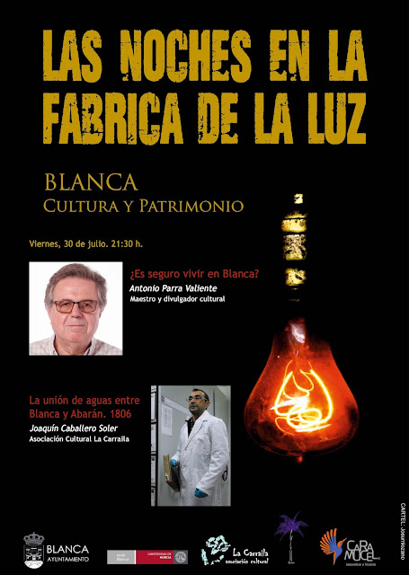 Como en las pasadas ediciones, estas conferencias tuvieron como escenario excepcional la ribera del Río Segura a su paso por Blanca, junto a la antigua Fábrica de la Luz de Blanca, sede del Centro de Interpretación de la Naturaleza (CIN). Próximas ediciones de Las Noches en la Fábrica de la Luz tendrán lugar a partir de octubre. Organiza: Ayuntamiento de Blanca, Sede Permanente de la Universidad de Murcia en Blanca, Asociación Cultural «La Carraila» y Caramucel, naturaleza e historia.