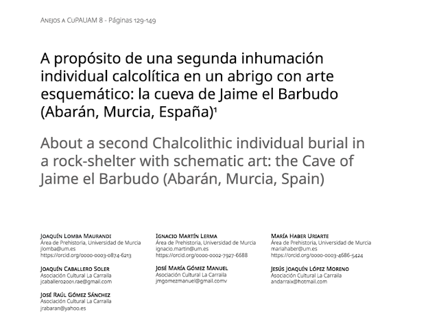 El pasado 7 de julio se lanzaba el número 8 de la revista Anejos a Cuadernos de Prehistoria y Arqueología de la Universidad Autónoma de Madrid, donde se recoge el artículo «A propósito de una segunda inhumación individual calcolítica en un abrigo con arte esquemático: la cueva de Jaime el Barbudo (Abarán, Murcia, España)», contribución firmada por Joaquín Lomba Maurandi, Ignacio Martín Lerma, María Haber Uriarte (Área de Prehistoria de la Universidad de Murcia), Joaquín Caballero Soler, José María Gómez Manuel, Jesús Joaquín López Moreno y José Raúl Gómez Sánchez (Asociación Cultural «La Carraila»).