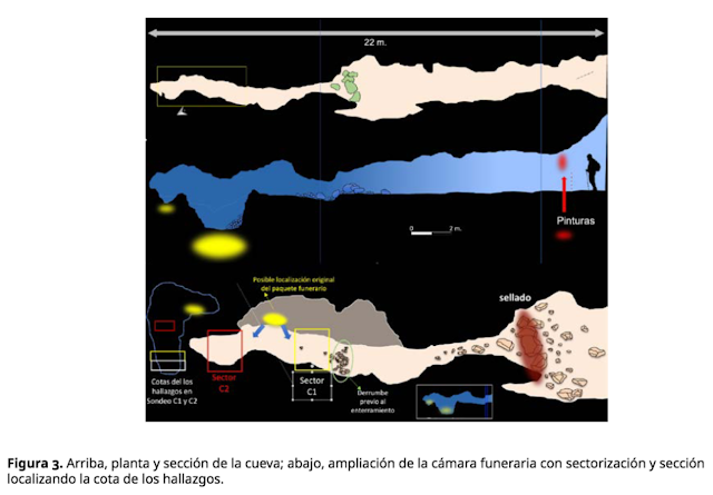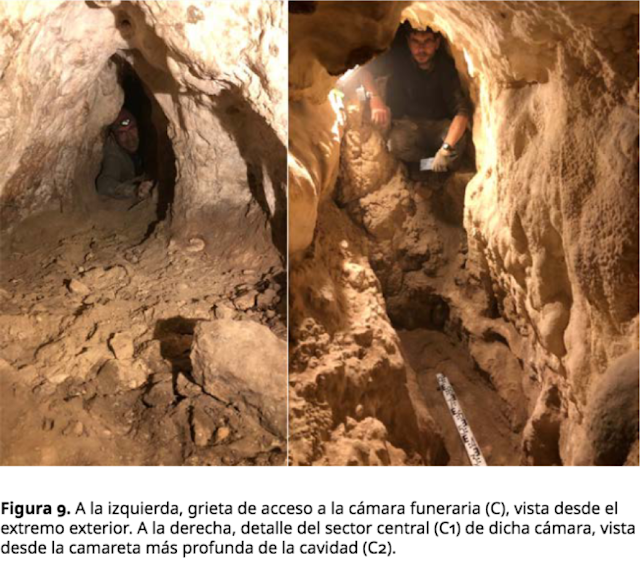 El análisis antropológico ha proporcionado la presencia de un individuo de sexo indeterminado, con una edad comprendida entre 25 y 31 años, datado por radiocarbono en el 4210 ± 30 BP. El enterramiento, localizado en la cámara más profunda de la cavidad, fue sellado, presentando ajuar lítico (ídolo, puntas de flecha y dos hachas). La presencia de arte rupestre (pinturas prehistóricas de estilo esquemático) y la localización de la cavidad a una cota elevada con respecto a la ruta natural de comunicación entre el campo de Mula y el Altiplano, así como la ausencia de hábitats conocidos en las proximidades, son rasgos comunes a otros yacimientos próximos, pudiendo responder el registro arqueológico a patrones de movilidad a lo largo de esa vía de comunicación.