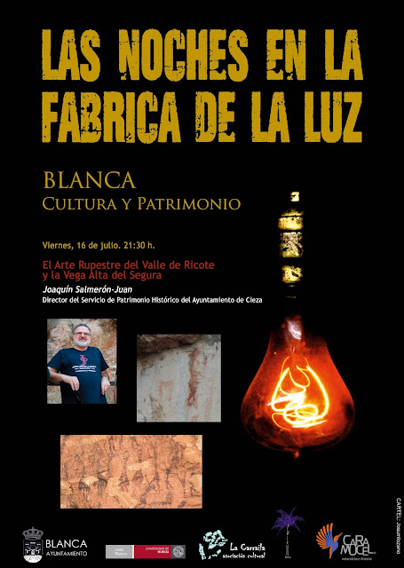 El 16 de julio, la inauguración del ciclo de conferencias Las Noches en la Fábrica de la Luz, a cargo de Joaquín Salmerón-Juan, director del Servicio de Patrimonio histórico del Ayuntamiento de Cieza, sirvió para presentar el hallazgo de las primeras pinturas rupestres prehistóricas en el término municipal de Blanca, en la conferencia inaugural “El Arte Rupestre del Valle de Ricote y la Vega Alta del Segura”.El reciente hallazgo, denunciado al Servicio de Patrimonio Histórico de la CARM por «La Carraila», «Caramucel» y la Sede Permanente de la Universidad de Murcia en Blanca el pasado 23 de noviembre de 2020, fue descubierto por el murciano Raúl Sánchez Villegas, tras una visita de índole deportiva en la modalidad de escalada, identificando una pared con pinturas rupestres.
