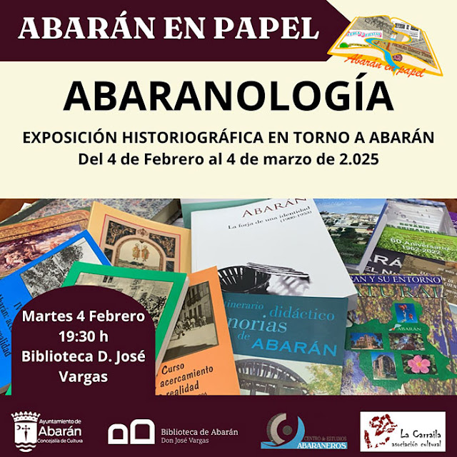 Dentro de las actividades enmarcadas en el proyecto «Abarán en papel», a partir del 4 de febrero se podrá visitar en la Biblioteca Municipal «D. José Vargas» la exposición «Abaranología», una muestra que reúne todas las publicaciones editadas en papel sobre Abarán. Esta exposición está organizada por la Concejalía de Cultura de este municipio y cuenta con la colaboración de la Biblioteca «D. José Vargas», el Centro de Estudios Abaraneros y la Asociación Cultural «La Carraila».