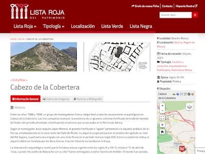 La solicitud de ingreso en la Lista Roja del Patrimonio fue solicitada por la Asociación Cultural «La Carraila» el pasado 4 de marzo, como una nueva acción de la campaña ¡Salvemos el Cabecico de la Cobertera!, dentro del proyecto cultural «Legado Vivo» (sección PROBICUVALLE), contando con el apoyo incondicional de los ayuntamientos de Abarán y Blanca, así como de otras entidades, como la asociación «Caramucel» o la Sede Permanente de la Universidad de Murcia en Blanca. Dicha solicitud fue evaluada por el comité científico de Hispania Nostra a través de su delegado en la Región de Murcia Miguel San Nicolás del Toro. La Lista Roja del Patrimonio es una iniciativa de la Asociación Hispania Nostra, que recoge aquellos elementos del Patrimonio Cultural Español que se encuentran sometidos a riesgo de desaparición, destrucción o alteración esencial de sus valores, al objeto de darlos a conocer y lograr su consolidación o restauración.