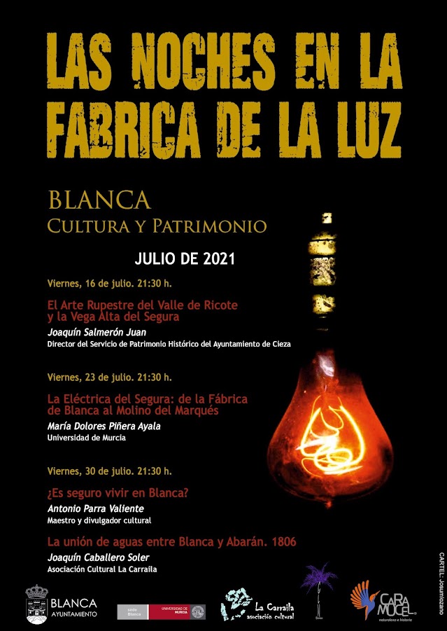 Como en la edición pasada, la conferencia ha tenido como escenario excepcional la ribera del Río Segura a su paso por Blanca, junto a la antigua Fábrica de la Luz de Blanca, sede del Centro de Interpretación de la Naturaleza (CIN). La Sede Permanente de la Universidad de Murcia en Blanca, la Asociación Cultural «La Carraila» y Caramucel, naturaleza e historia, como organizadores de Las Noches en la Fábrica de la Luz, dan las gracias a María Dolores Piñera Ayala por esta conferencia de lujo que tanto enriqueció al público asistente.