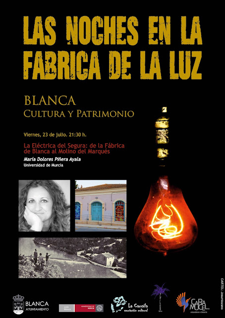 Este viernes 23 de julio ha continuado el ciclo Las Noches en la Fábrica de la Luz, con la conferencia de María Dolores Piñera Ayala. La doctora habló de la Sociedad Eléctrica del Segura y dos de sus fábricas de luz: la fábrica de Blanca, inaugurada en 1893, y la del Molino del Marqués, ubicada en Murcia, que comenzó a funcionar en 1903.