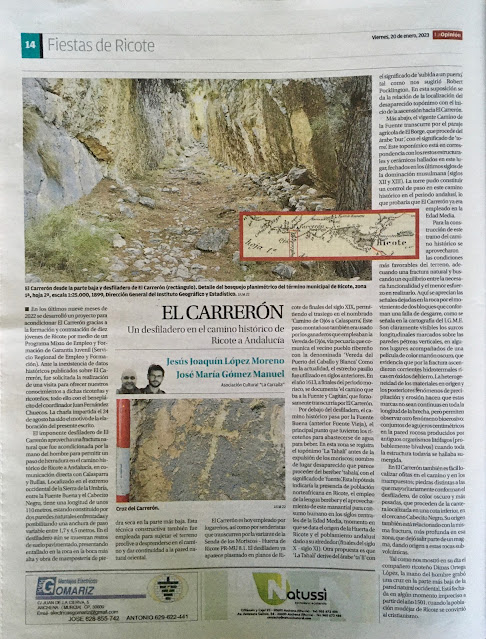 Como en ediciones anteriores, miembros de la Asociación Cultural «La Carraila» han aportado su saber en el suplemento de las fiestas de Ricote del periódico La Opinión de Murcia, especial coordinado por Alberto Guillamón e hijos desde hace 35 años. En sus páginas se pueden leer los artículos «El Carrerón. Un desfiladero en el camino histórico de Ricote a Andalucía», de Jesús Joaquín López Moreno y José María Gómez Manuel, y «Las Salinas de los Charcos en Ricote», de Joaquín Caballero Soler. Pinchando en sus títulos, podéis acceder a su versión digital.