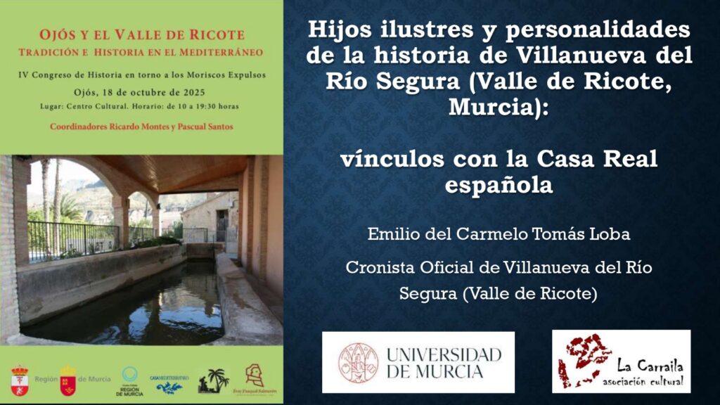 A través de este trabajo vamos a caminar por la vida de hijos ilustres de Villanueva del Río Segura (Valle de Ricote, Murcia) así como también personalidades cuya labor incidió en la vida del pueblo, directa o indirectamente. Estas figuras que traemos a estas líneas consiguieron logros personales y colectivos sobresalientes, acaso incluso inimaginables para la época, fortaleciendo siempre el buen nombre de la villa que o bien los vio nacer o a la cual se vincularon, dejando para ello una porción de historia en la propia historia local. Además, el factor que realza estas trayectorias viene subrayado por el vínculo establecido entre la Casa Real española y esta pequeña localidad valricotí.