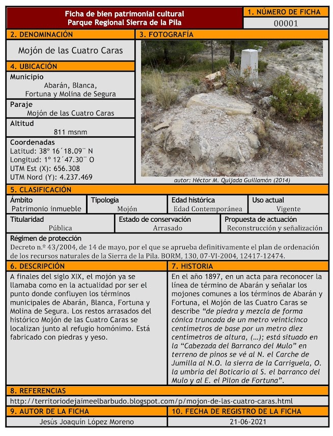 Hace un año se inició la causa asociativa, desde «La Carraila» y «Caramucel, naturaleza e historia», y administrativa, desde Abarán, Blanca, Fortuna y Molina de Segura, para restituir el Mojón de las Cuatro Caras y emplearlo como seña de identidad del Parque Regional Sierra de la Pila (Primeros pasos administrativos para recuperar y señalizar el Mojón de las Cuatro Caras). Esta mañana, Felipe García Carrillo, concejal de cultura de Abarán nos ha comunicado que la Dirección General de Medio Natural va a reconstruir el Mojón de las Cuatro Caras. Sin duda, será un relevante elemento que servirá para crear el recurso de turismo cultural «Sierra de la Pila, Legado Vivo», dentro del proyecto cultural «Legado Vivo» (https://legadovivo.blogspot.com/).