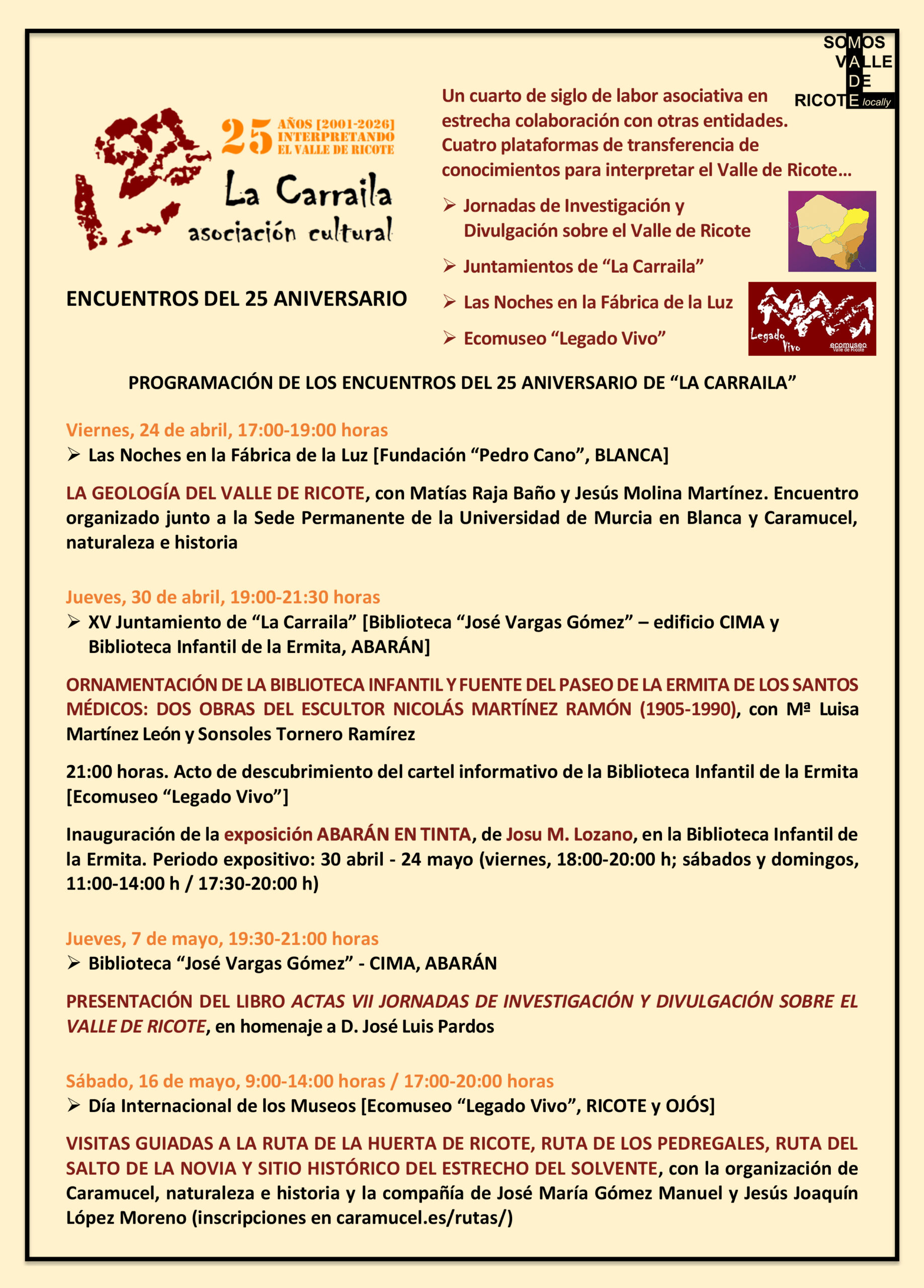Con el lema «25 años interpretando el Valle de Ricote», la Asociación Cultural «La Carraila» está celebrando su 25 aniversario. Con motivo de esta efeméride, para los meses de abril y mayo se han programado cuatro encuentros relacionados con las cuatro plataformas de transferencia de conocimientos creados en este cuarto de siglo de andadura para interpretar el Valle de Ricote: Jornadas de Investigación y Divulgación sobre el Valle de Ricote, Juntamientos de «La Carraila», Las Noches en la Fábrica de la Luz y Ecomuseo «Legado Vivo». En esta programación queda incluida la inédita exposición «Abarán en tinta» del abaranero Josu M. Lozano. Geología de la comarca, Biblioteca Infantil y Fuente del Paseo de la Ermita de los Santos Médicos, presentación del libro Actas VII Jornadas de Investigación y Divulgación sobre el Valle de Ricote y visitas guiadas para interpretar elementos del paisaje cultural valricotí formarán parte, durante 14 horas, de los Encuentros del 25 Aniversario de «La Carraila».