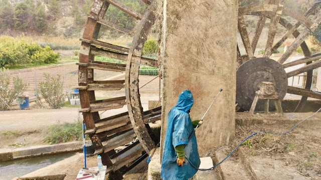 Hace una semana, gracias a las labores de mantenimiento gestionadas por los agricultores que custodian la Noria de la Hoya de Don García, operarios de las empresas abaraneras «Hermanos Tornero» y «Hermanos Ariño» sacaron a la luz la fecha de instalación de la última rueda. Los trabajos de limpieza dejaron visible una fecha incisa en el enlucido de uno de los pilares que sustentan una de las canalizaciones del agua elevada por la noria: 19-03-1946; datación absoluta acompañada por la firma «Gómez», que corresponde al abaranero D. Fernando Gómez Gómez «de Hoya», comisario de dicho heredamiento por entonces. A este autor también se debe la realización de la escultura de San Juan Evangelista que procesiona en la Semana Santa abaranera, tallada con sus manos y datada un año después.