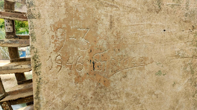 Hace una semana, gracias a las labores de mantenimiento gestionadas por los agricultores que custodian la Noria de la Hoya de Don García, operarios de las empresas abaraneras «Hermanos Tornero» y «Hermanos Ariño» sacaron a la luz la fecha de instalación de la última rueda. Los trabajos de limpieza dejaron visible una fecha incisa en el enlucido de uno de los pilares que sustentan una de las canalizaciones del agua elevada por la noria: 19-03-1946; datación absoluta acompañada por la firma «Gómez», que corresponde al abaranero D. Fernando Gómez Gómez «de Hoya», comisario de dicho heredamiento por entonces. A este autor también se debe la realización de la escultura de San Juan Evangelista que procesiona en la Semana Santa abaranera, tallada con sus manos y datada un año después.