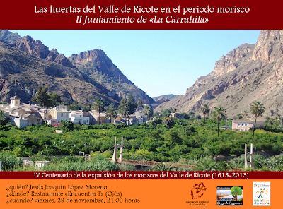 Nuestra asociación cultural ha programado el II Juntamiento de «La Carrahila» para el próximo viernes 29 de noviembre, a las 21:00 horas, en el Restaurante «Encuentra T» de Ojós. En la segunda edición, contaremos con la charla del compañero Jesús Joaquín López Moreno, bajo el título «Las huertas del Valle de Ricote en el periodo morisco». En el acto, también intervendrá (así se ha confirmado a última hora), Enrique Pérez Cañamares, doctor en Historia y autor de una de las páginas web más interesantes sobre el tema morisco (losmoriscos.es), quien se adentrará en el drama que supuso la expulsión morisca de las tierras españolas. El encuentro se enmarca dentro de los actos programados en el IV Centenario de la expulsión de los moriscos del Valle de Ricote (1613-2013).