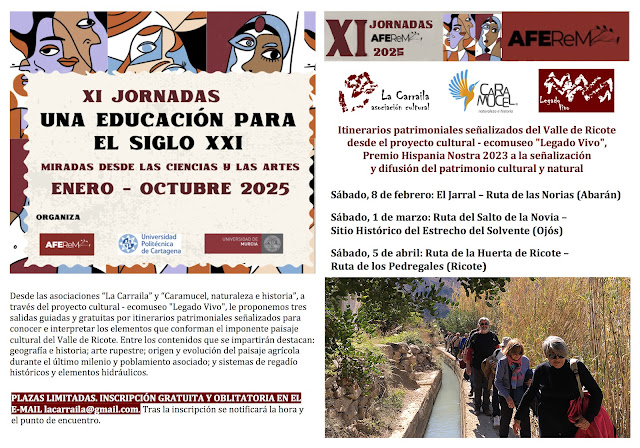 Las asociaciones «La Carraila» y «Caramucel, naturaleza e historia» participan en las XI Jornadas «Una educación para el siglo XXI», organizadas por la asociación “FUTURO de la Educación-Región de Murcia» (AFEReM), la Universidad de Murcia y la Universidad Politécnica de Cartagena. Desde el proyecto cultural – ecomuseo «Legado Vivo» se han programado tres salidas guiadas y gratuitas por itinerarios patrimoniales señalizados para conocer e interpretar los elementos que conforman el imponente paisaje cultural del Valle de Ricote. Entre los contenidos que se impartirán destacan: geografía e historia; arte rupestre; origen y evolución del paisaje agrícola durante el último milenio y poblamiento asociado; y sistemas de regadío históricos y elementos hidráulicos.