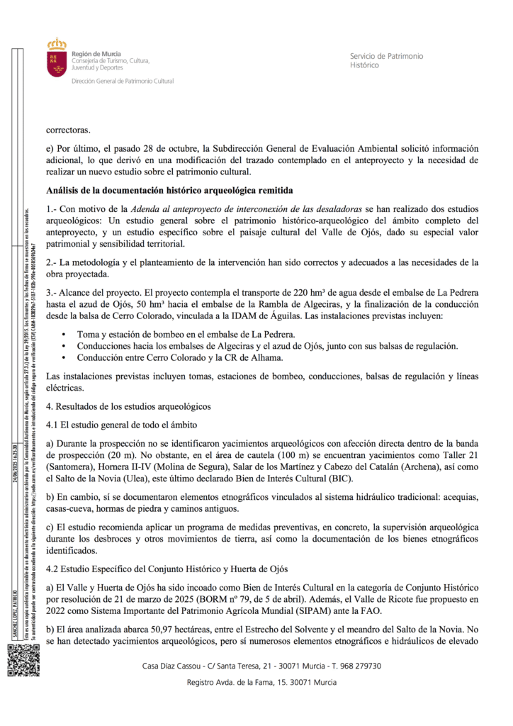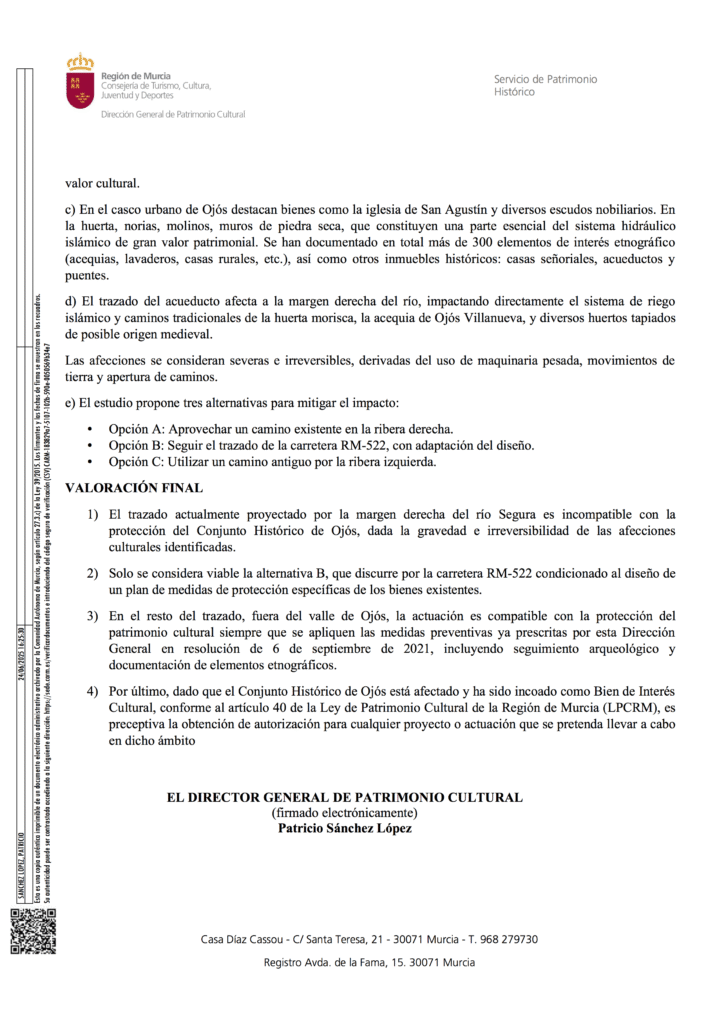– El trazado actualmente proyectado por la margen derecha del Río Segura es incompatible con la protección del Conjunto Histórico de Ojós, dada la gravedad e irreversibilidad de las afecciones culturales identificadas.