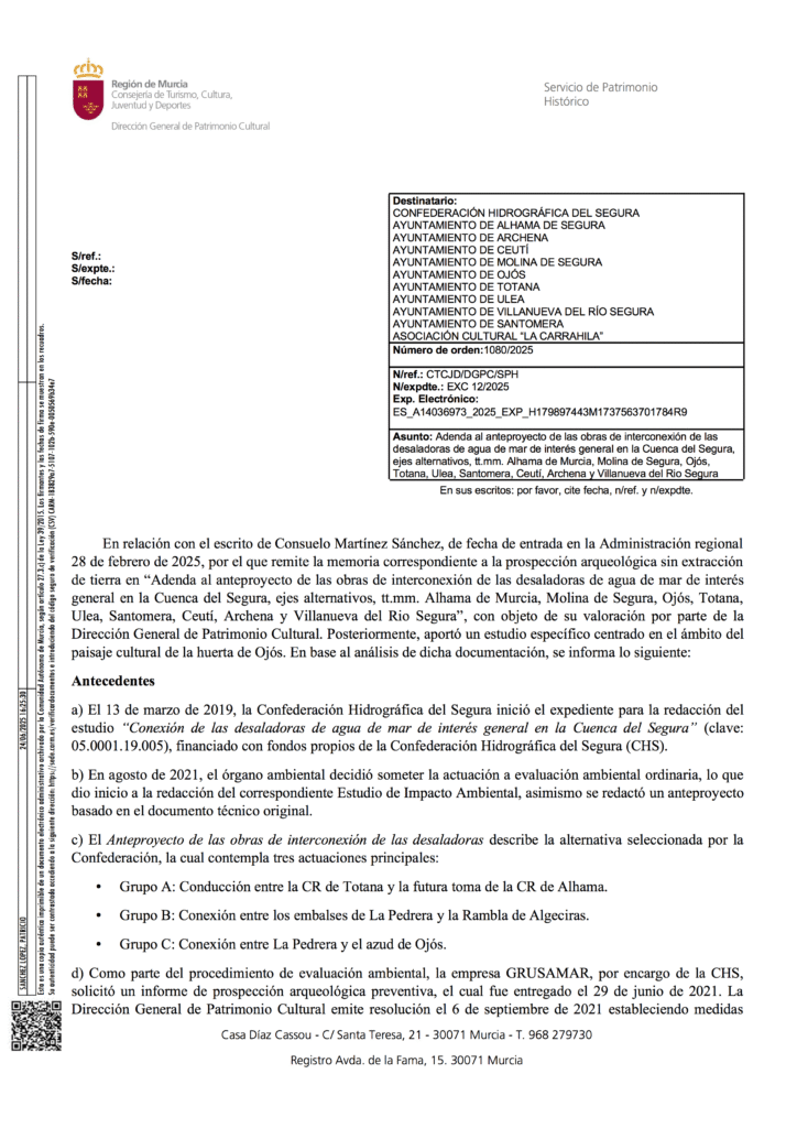 En dicho escrito emitido desde el Servicio de Patrimonio Histórico a la Confederación Hidrográfica del Segura, a los ayuntamientos implicados en dicho anteproyecto y a la Asociación Cultural «La Carraila» se manifiesta que:
