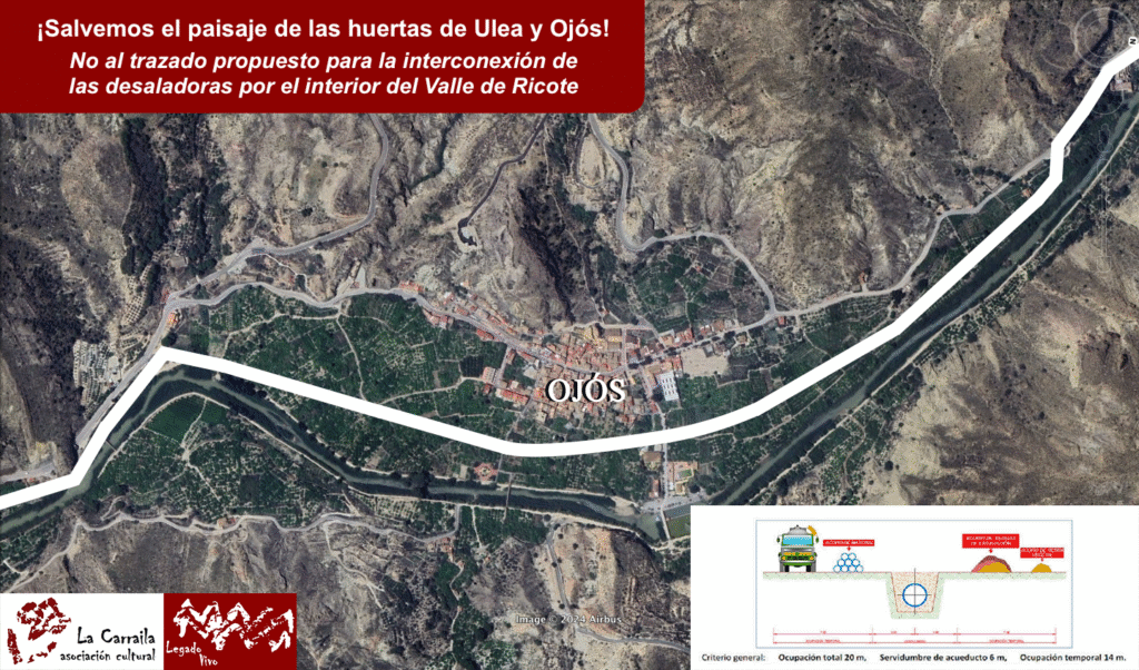 La Asociación Cultural «La Carraila» muestra su satisfacción de esta adenda al anteproyecto de las obras de interconexión de las desaladoras de agua de mar de interés general en la Cuenca del Segura, esperando que la canalización de agua desalada no sólo no afecte al Conjunto Histórico de Ojós, sino que también no transcurra por el interior del Valle de Ricote, tal como esta institución lleva defendiendo desde que se iniciara la campaña ¡Salvemos el paisaje de las huertas de Ulea y Ojós!