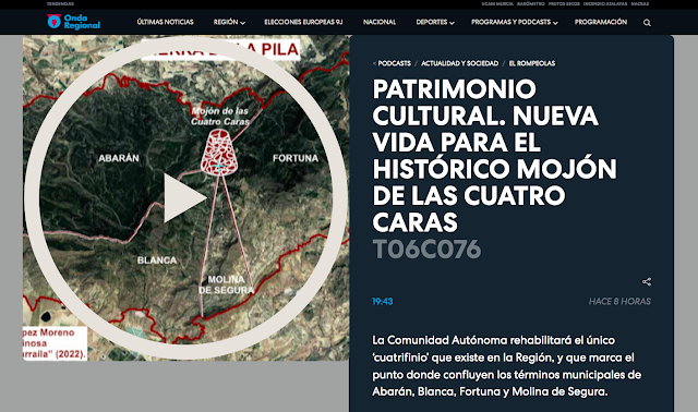 Tal como se ha anunciado desde la página web de la Comunidad Autónoma de la Región de Murcia, en dos meses será realidad la rehabilitación del histórico Mojón de las Cuatro Caras y su entorno del Parque Regional Sierra de la Pila. El cuatrifinio de Abarán, Blanca, Fortuna y Molina de Segura, que se encuentra arrasado, así como el refugio anexo serán puestos en valor con una inversión de 39.322 euros. Como indican desde la CARM, la propuesta de adecuación surgió de la Asociación Cultural «La Carraila» y de los cuatro ayuntamientos que comparten el terreno del parque regional, quienes, en otoño de 2022, presentaron en sus respectivos plenos una moción para solicitar la reconstrucción y señalización del histórico mojón.