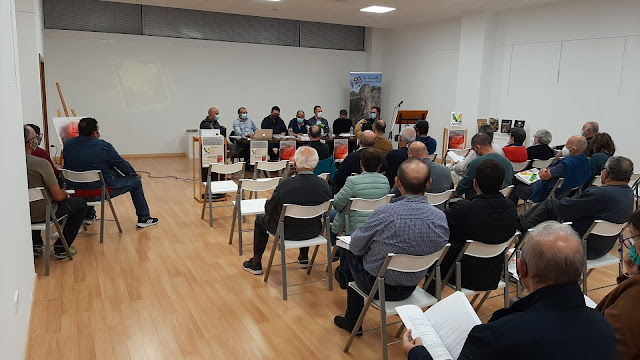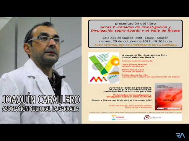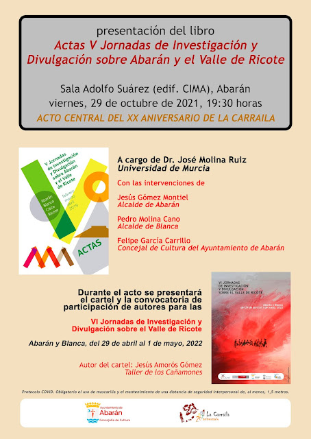 Unas 50 personas asistieron al acto central del XX Aniversario de «La Carraila», que tuvo lugar este viernes 29 de octubre, a las 19:30 horas, en la Sala Adolfo Suárez (edif. CIMA) de Abarán. En la convocatoria se presentó el libro de actas de las pasadas V Jornadas de Investigación y Divulgación sobre Abarán y el Valle de Ricote (2019) y se dio a conocer el cartel y la nueva convocatoria de participación de autores para la próxima edición (2022).El libro Actas V Jornadas de Investigación y Divulgación sobre Abarán y el Valle de Ricote (pinche sobre el título para acceder a su contenido digital) fue presentado por Dr. José Molina Ruiz, profesor del Departamento de Geografía de la Universidad de Murcia; acto en el que también intervinieron Jesús Gómez Montiel, alcalde de Abarán, Pedro Molina Cano, alcalde de Blanca, y Felipe García Carrillo, concejal de cultura del ayuntamiento de Abarán, quien organizó este evento junto a «La Carraila». A estas dos entidades se les debe la edición en papel de la obra presentada.