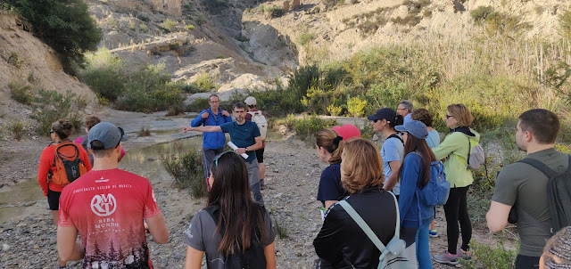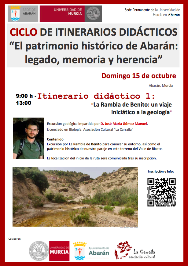 El domingo 15 de octubre, con motivo del ciclo «El patrimonio histórico de Abarán» organizado por la Sede Permanente de la Universidad de Murcia en Abarán, se realizó el primer itinerario didáctico en colaboración con la Asociación Cultural «La Carraila». Aprovechando la infraestructura creada desde el proyecto cultural «Legado Vivo», el compañero José María Gómez Manuel guió una ruta por el itinerario patrimonial «Fuente de Benito». Los enormes recursos naturales y culturales de este enclave fueron empleados para acercar diversos contenidos científicos al público, en especial centrados en su interesante geología, pero también con algunos apuntes sobre su flora y fauna, sin olvidar los vestigios del poblamiento humano de la Rambla de Benito. La ruta contó con la ayuda de Lorenzo Puche Aroca, de la Sede Permanente de la Universidad de Murcia en Abarán, a quien se le debe la autoría de las fotografías.