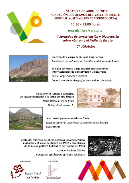 Fue una mañana estupenda, plenamente primaveral (sol, nubes, algo de rasca y lluvia). Durante las comunicaciones pudimos conocer las posibilidades administrativas para que nuestro Valle de Ricote tenga una figura de protección, tan especial, como la de Patrimonio de la Humanidad, todo de la mano de Miguel Ángel Sánchez-Sánchez; en la que María Dolores Piñera Ayala recorrió el Río Segura a través de sus centenarias fábricas de luz; en la que Joaquín Salmerón Juan y María José Morcillo Sánchez mostraron las piezas arqueológicas recuperadas en manos particulares para el disfrute general; y en la que el alamita y abaranero Alfredo Jiménez Gómez desveló los antecedentes del Trasvase Tajo-Segura en los años previos a la Guerra Civil. Una jornada muy disfrutada por los que nos acercamos a ese paraíso de La Hoya de los Álamos, irrigada desde el medievo (para nada desde la Antigüedad), por la Acequia Andelma, a pies del Hisn Siyasa (siglos XI-XIII), puerta norte del Valle de Ricote…