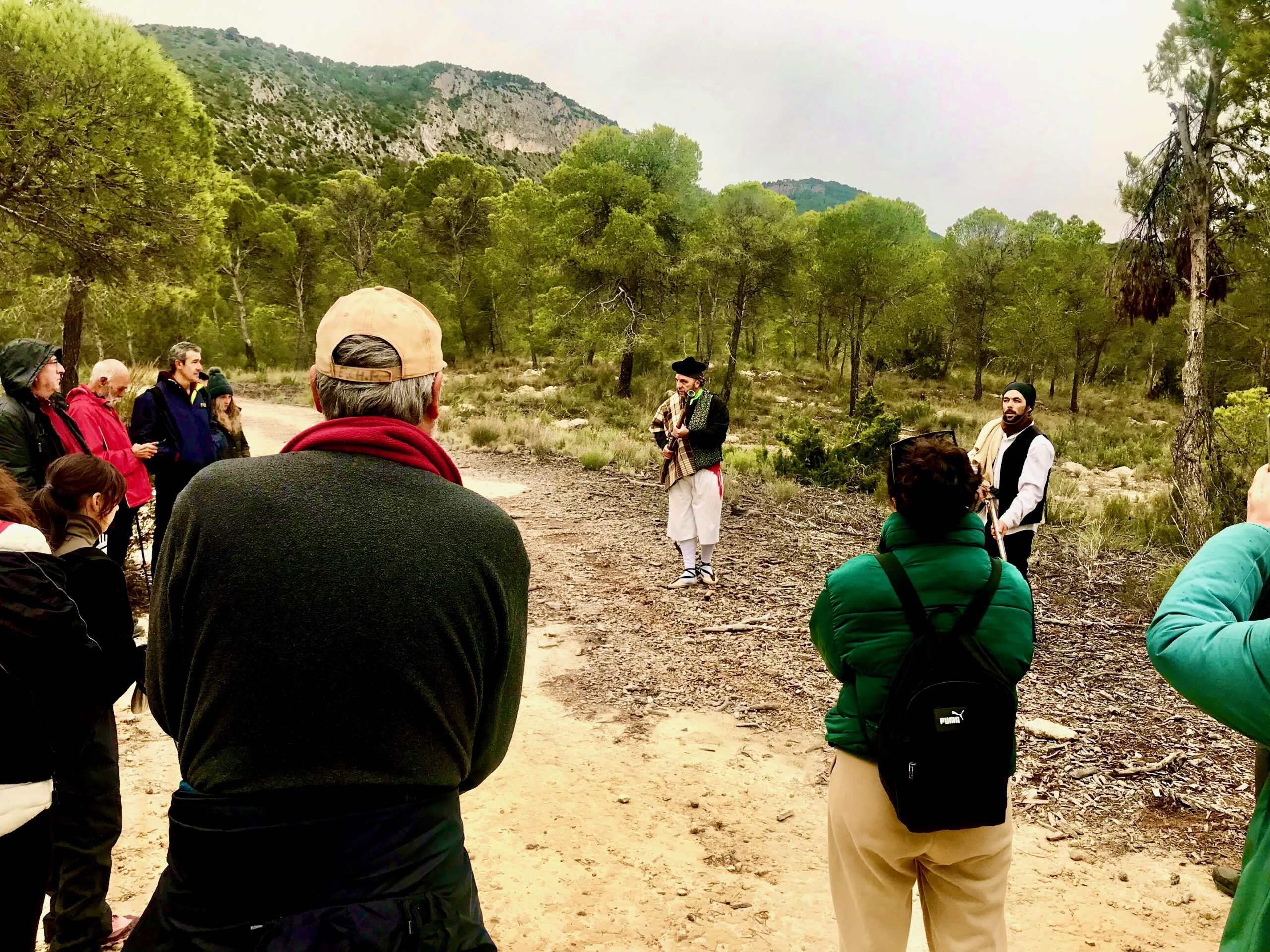 En la salida guiada y teatralizada por Territorio de Jaime «el Barbudo», el público se impregnó de los valores naturales y culturales de la Sierra de la Pila, tomando como hilo conductor el bandolero más famoso del sureste peninsular. En la puesta en escena de la obra «El botín de El Barbudo» participaron Mariola Ferri Bernal en el papel de Gregoria, Asier Medrano Camacho representando a Amorós, Nacho Palazón Mira como Pelón y Octavio Ortuño Pérez haciendo de Jaime «el Barbudo».