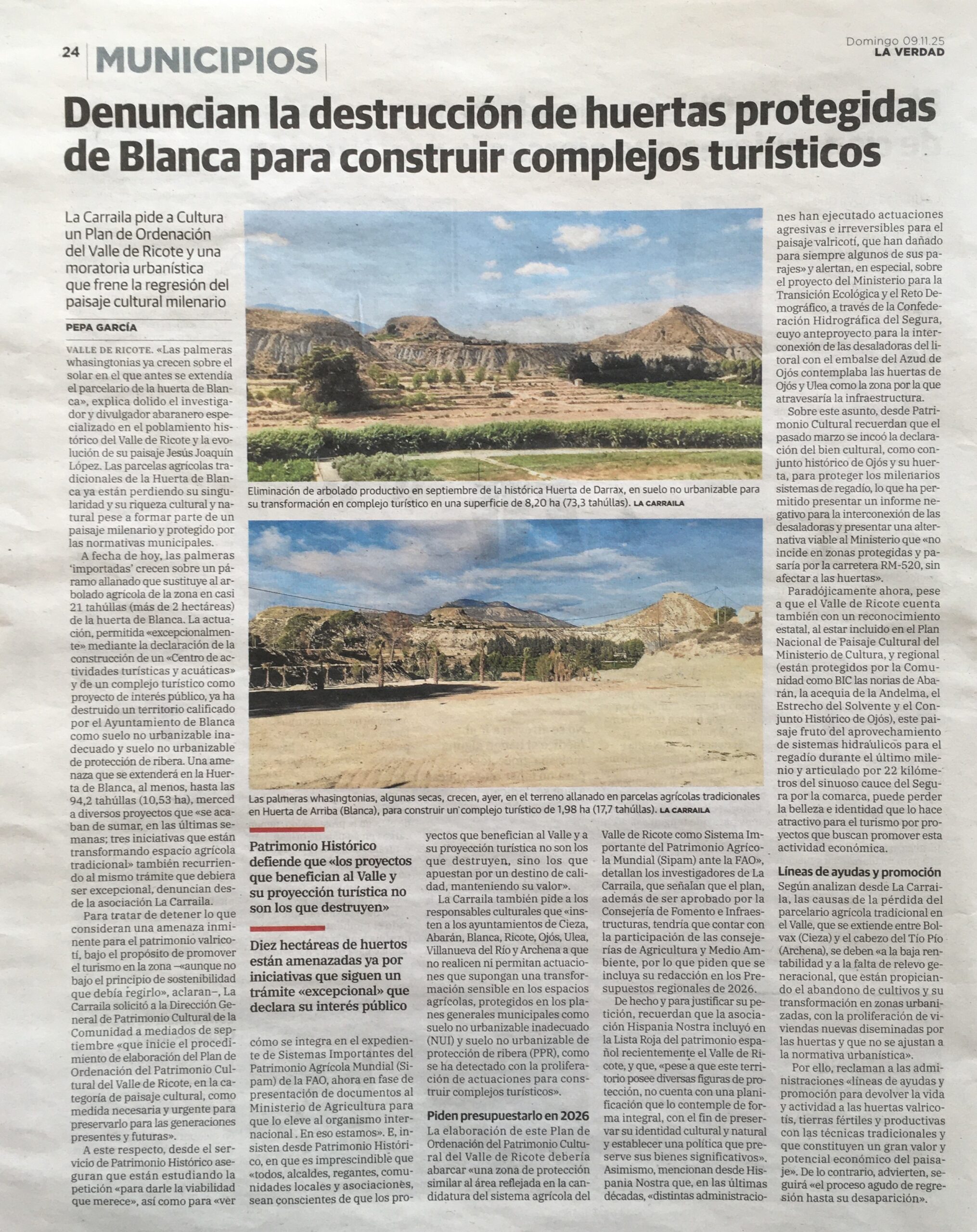 La Asociación Cultural “La Carraila” ha solicitado a la Dirección General de Patrimonio Cultural de la Comunidad Autónoma de la Región de Murcia que inicie el procedimiento de elaboración del Plan de Ordenación del Patrimonio Cultural del Valle de Ricote, en la categoría de paisaje cultural, como medida necesaria y urgente para preservar sus valores culturales para las generaciones presentes y futuras, así como que inste a los ayuntamientos de Cieza, Abarán, Blanca, Ricote, Ojós, Ulea, Villanueva del Río Segura y Archena a que no realicen ni permitan actuaciones que supongan una transformación sensible en los distintos espacios agrícolas protegidos en los distintos planes generales municipales de ordenación como suelo no urbanizable inadecuado (NUI) y suelo no urbanizable de protección de ribera (PPR), tal como se ha detectado en las últimas semanas con la proliferación de actuaciones para la proyección de complejos turísticos en esta tipología de parcelario agrícola tradicional.