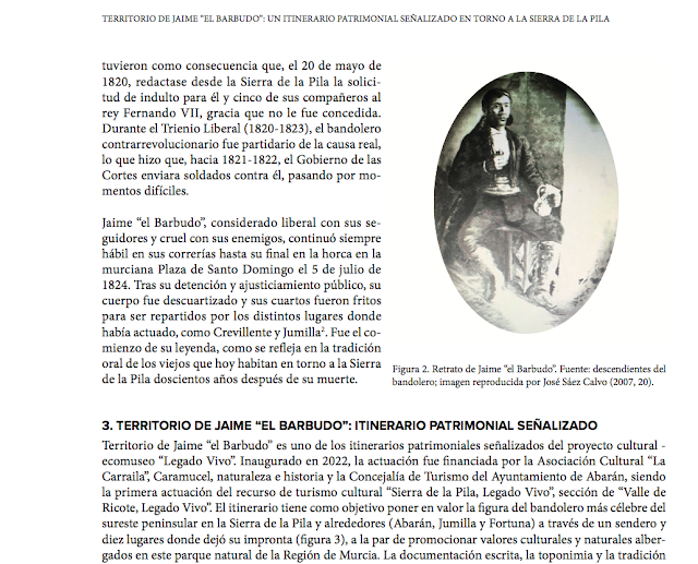 Territorio de Jaime “el Barbudo” es un itinerario patrimonial señalizado en la Sierra de la Pila y alrededores (Abarán, Jumilla y Fortuna), que pone en valor el legado inmaterial dejado por el que está considerado el bandolero más célebre del sureste peninsular. La documentación escrita, la toponimia y una tradición oral muy presente en esas latitudes han sido las fuentes empleadas para promocionar las huellas del contrarrevolucionario Jaime José Cayetano Alfonso Juan “el Barbudo” (1783-1824), del que se cumplen doscientos años de su ejecución pública. El itinerario, inaugurado en 2022, fue planificado desde el proyecto cultural – ecomuseo “Legado Vivo” por las asociaciones “La Carraila” y “Caramucel, naturaleza e historia”, siendo cofinanciado por la Concejalía de Turismo del Ayuntamiento de Abarán.