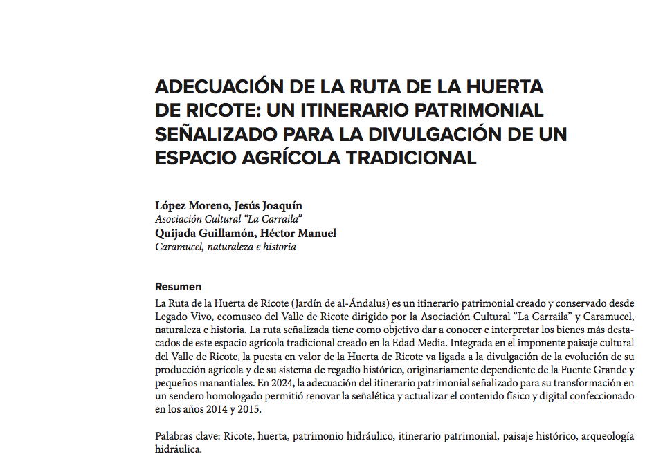 Por último, los compañeros Jesús Joaquín López Moreno y Héctor Manuel Quijada Guillamón publican la síntesis de la actuación ejecutada en la Ruta de la Huerta de Ricote bajo el título Adecuación de la Ruta de la Huerta de Ricote: un itinerario patrimonial señalizado para la divulgación de un espacio agrícola tradicional.