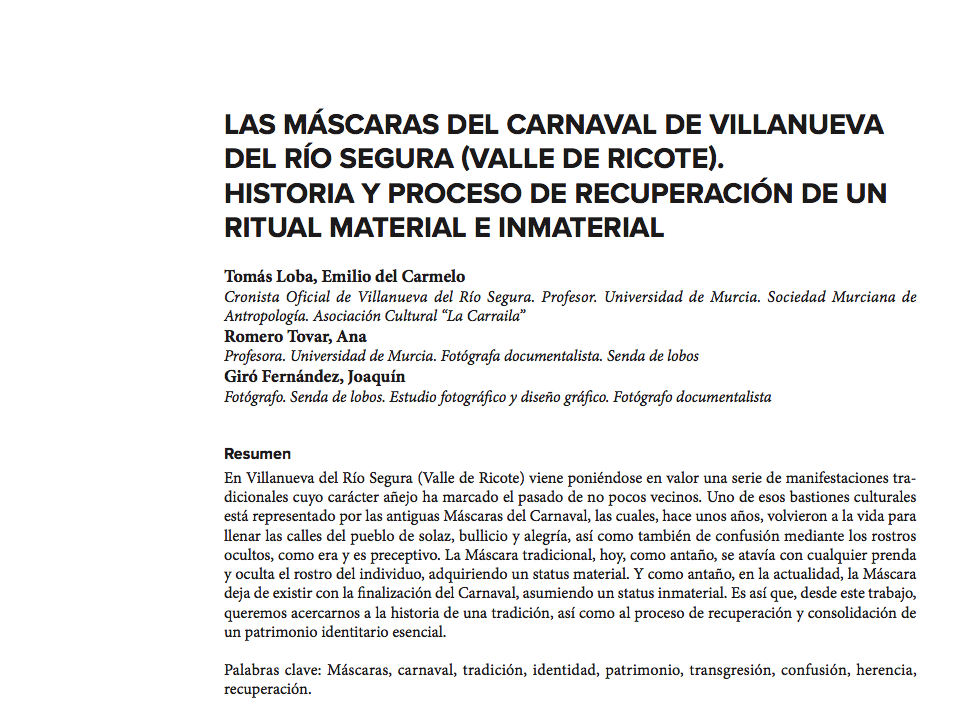 Las Máscaras del Carnaval de Villanueva del Río Segura (Valle de Ricote). Historia y proceso de recuperación de un ritual material e inmaterial es el artículo firmado por el socio Emilio del Carmelo Tomás Loba, Ana Romero Tovar y Joaquín Giró Fernández, que versa sobre la puesta en valor de las Máscaras del Carnaval en esta población valricotí.