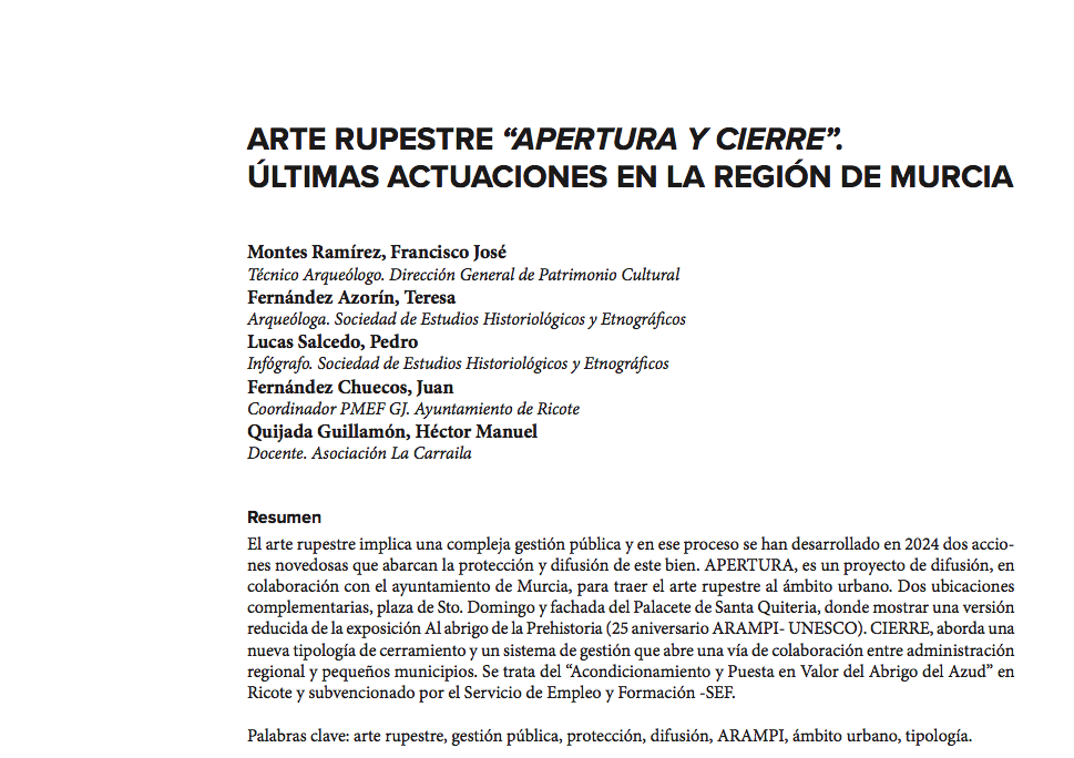 Arte rupestre «apertura y cierre». Últimas actuaciones en la Región de Murcia es el título del estudio presentado por el compañero Héctor Manuel Quijada Guillamón y los autores Francisco José Montes Ramírez, Teresa Fernández Azorín, Pedro Lucas Salcedo y Juan Fernández Chuecos, donde se presenta la actuación de cerramiento de las pinturas rupestres prehistóricas de Los Pedregales de Ricote.